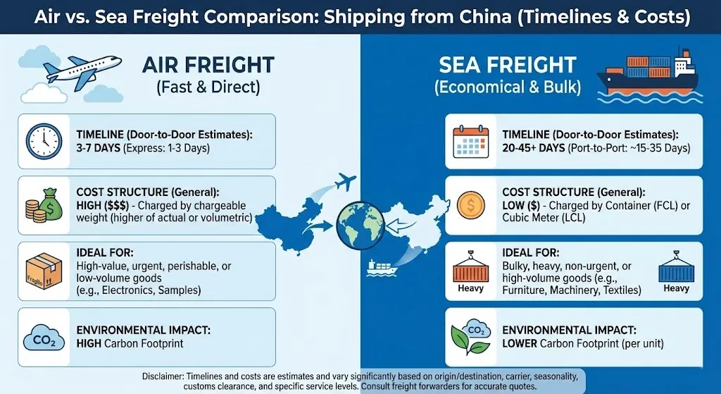 (في الأعلى: مخطط معلوماتي لمقارنة الشحن الجوي والبحري للشحن من الصين، مع تسليط الضوء على الجداول الزمنية والتكاليف)